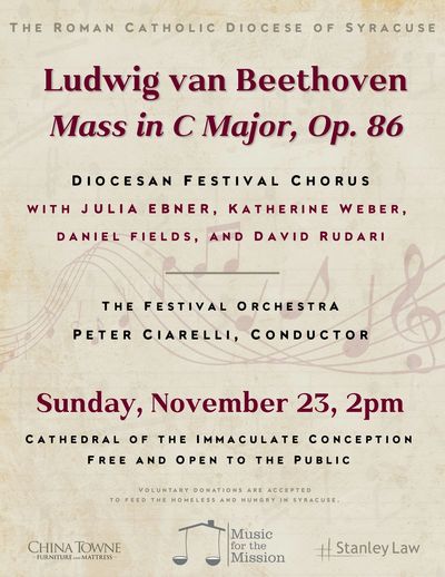 You are invited to a beautiful afternoon of sacred music! The Diocese of Syracuse presents Ludwig van Beethoven’s Mass in C Major, Op. 86 in conjunction with the feast of St. Cecilia patron saint of music, featuring a festival choir of over 120 singers from around the diocese, soloists Julia Ebner, Katherine Weber, Daniel Fields, and David Rudari, accompanied by a Festival Orchestra all under the direction of Peter Ciarelli.